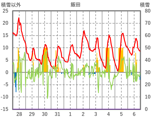 | 日 | 時 | 気温 | 降水 | 風向/風速 | 日照 | 積雪 | 降雪 |
