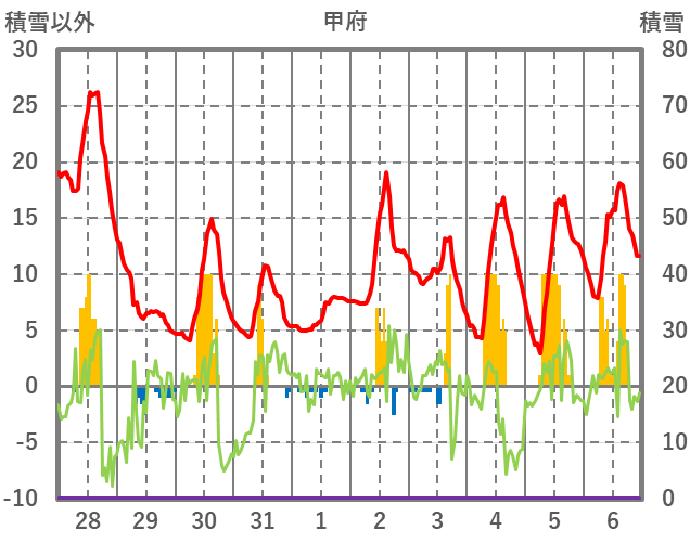 | 日 | 時 | 気温 | 降水 | 風向/風速 | 日照 | 積雪 | 降雪 |