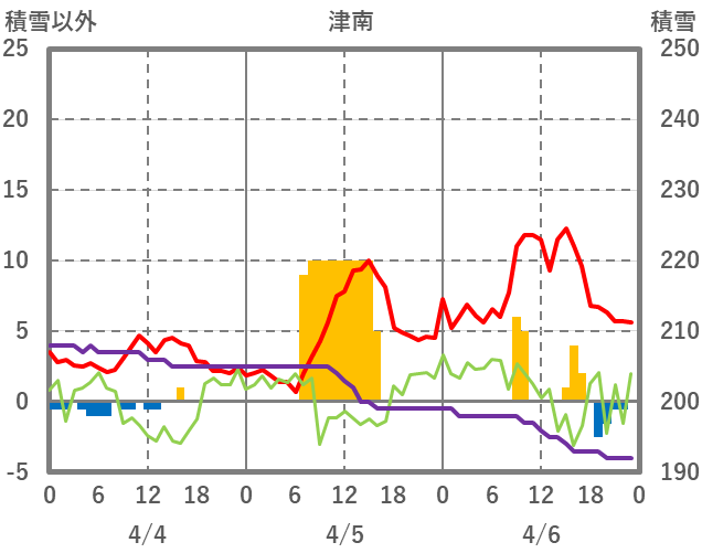 | 日 | 時 | 気温 | 降水 | 風向/風速 | 日照 | 積雪 | 降雪 |