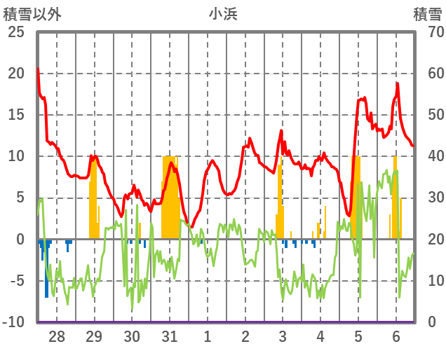 | 日 | 時 | 気温 | 降水 | 風向/風速 | 日照 | 積雪 | 降雪 |
