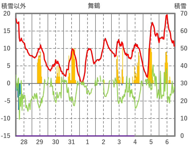 | 日 | 時 | 気温 | 降水 | 風向/風速 | 日照 | 積雪 | 降雪 |