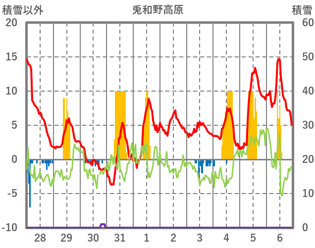 | 日 | 時 | 気温 | 降水 | 風向/風速 | 日照 | 積雪 | 降雪 |