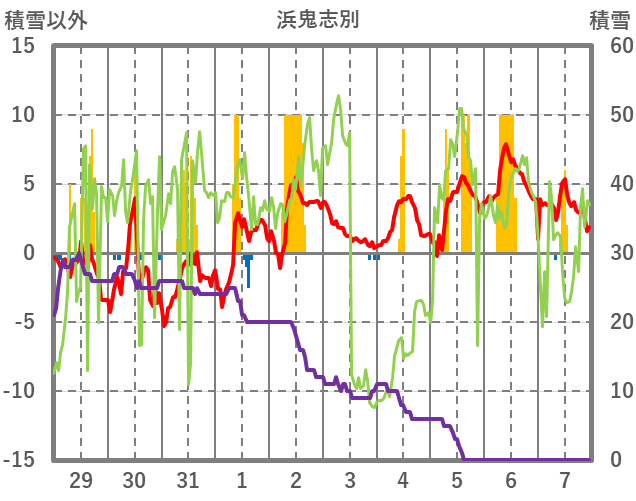 | 日 | 時 | 気温 | 降水 | 風向/風速 | 日照 | 積雪 | 降雪 |
