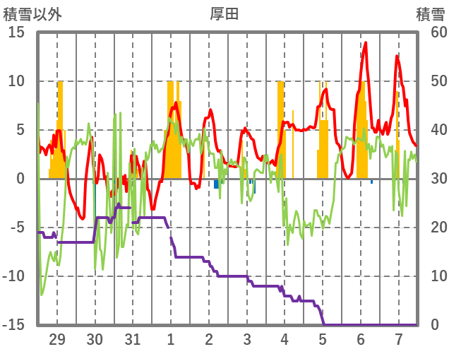 | 日 | 時 | 気温 | 降水 | 風向/風速 | 日照 | 積雪 | 降雪 |
