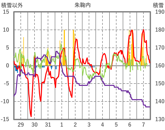 | 日 | 時 | 気温 | 降水 | 風向/風速 | 日照 | 積雪 | 降雪 |