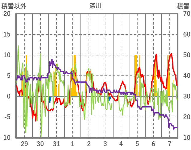 | 日 | 時 | 気温 | 降水 | 風向/風速 | 日照 | 積雪 | 降雪 |