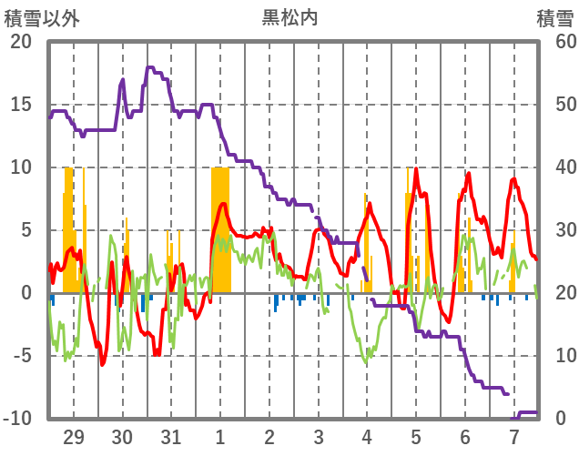 | 日 | 時 | 気温 | 降水 | 風向/風速 | 日照 | 積雪 | 降雪 |