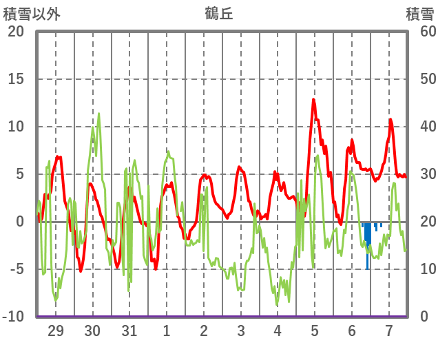 | 日 | 時 | 気温 | 降水 | 風向/風速 | 日照 | 積雪 | 降雪 |