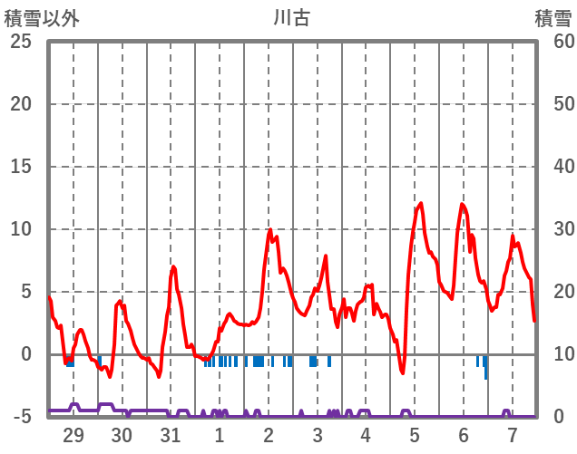 | 日 | 時 | 気温 | 降水 | 風向/風速 | 日照 | 積雪 | 降雪 |