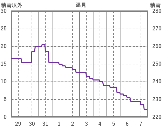 | 日 | 時 | 気温 | 降水 | 風向/風速 | 日照 | 積雪 | 降雪 |