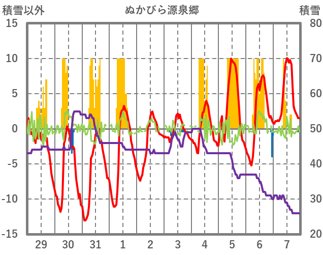 | 日 | 時 | 気温 | 降水 | 風向/風速 | 日照 | 積雪 | 降雪 |