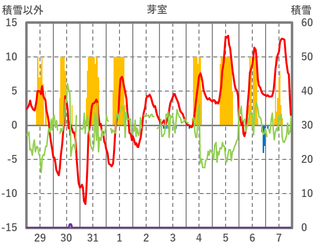 | 日 | 時 | 気温 | 降水 | 風向/風速 | 日照 | 積雪 | 降雪 |