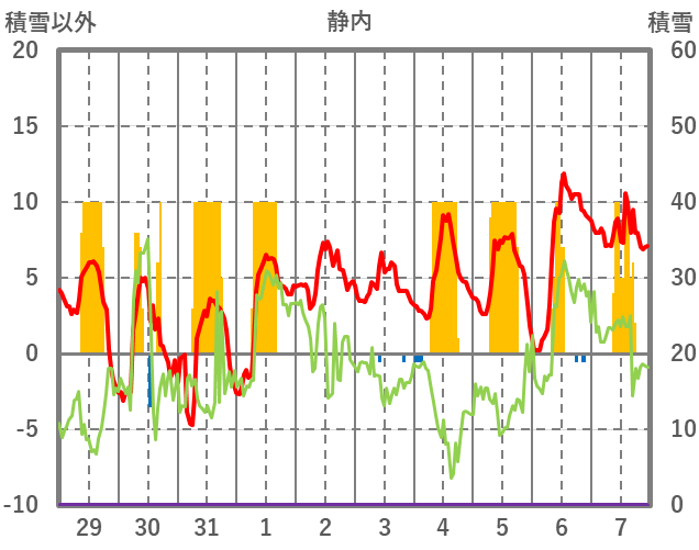 | 日 | 時 | 気温 | 降水 | 風向/風速 | 日照 | 積雪 | 降雪 |