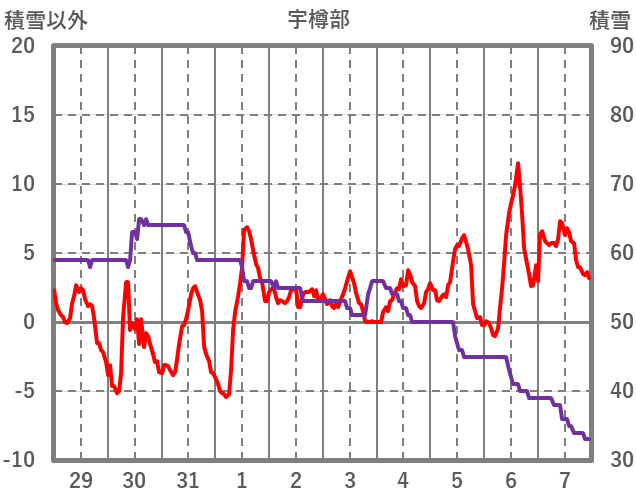 | 日 | 時 | 気温 | 降水 | 風向/風速 | 日照 | 積雪 | 降雪 |