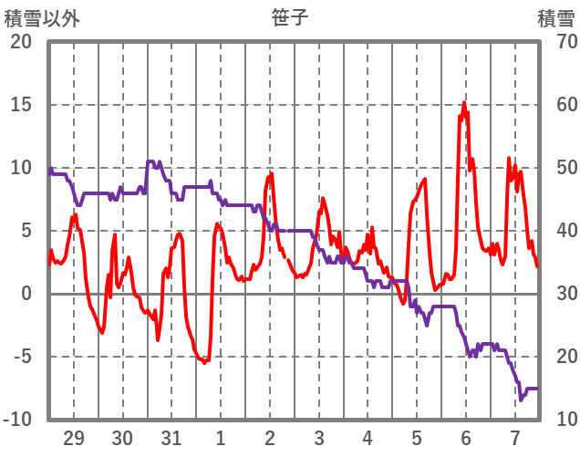 | 日 | 時 | 気温 | 降水 | 風向/風速 | 日照 | 積雪 | 降雪 |