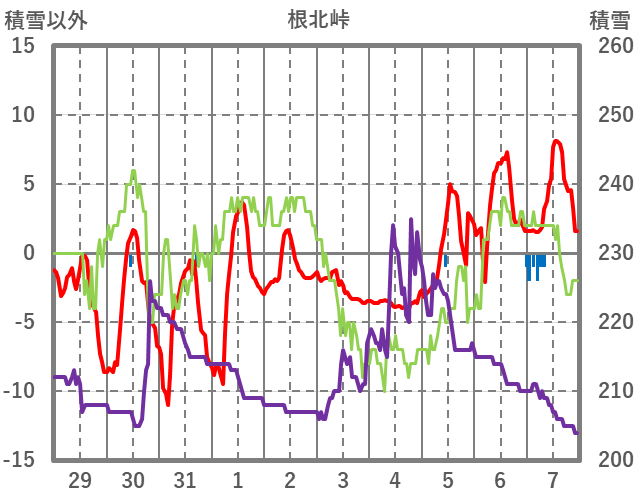 | 日 | 時 | 気温 | 降水 | 風向/風速 | 日照 | 積雪 | 降雪 |