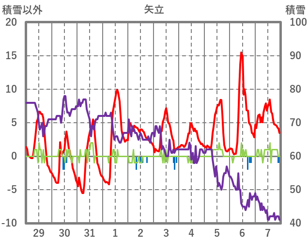 | 日 | 時 | 気温 | 降水 | 風向/風速 | 日照 | 積雪 | 降雪 |