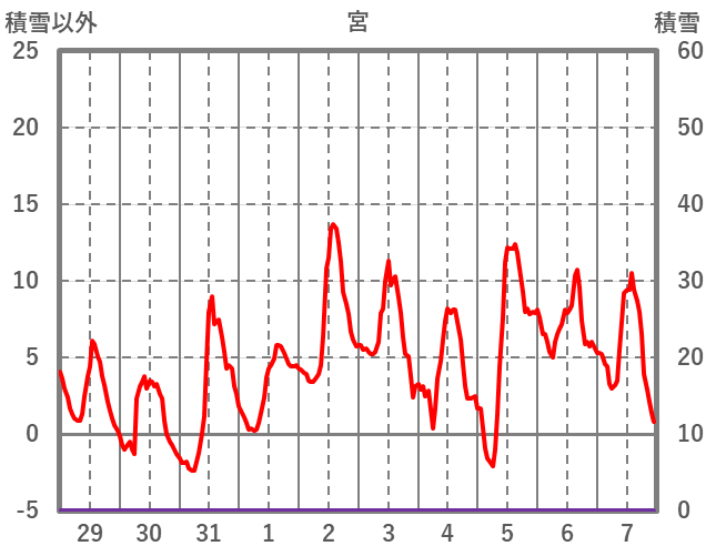 | 日 | 時 | 気温 | 降水 | 風向/風速 | 日照 | 積雪 | 降雪 |