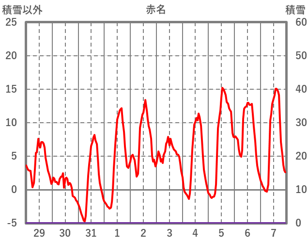 | 日 | 時 | 気温 | 降水 | 風向/風速 | 日照 | 積雪 | 降雪 |