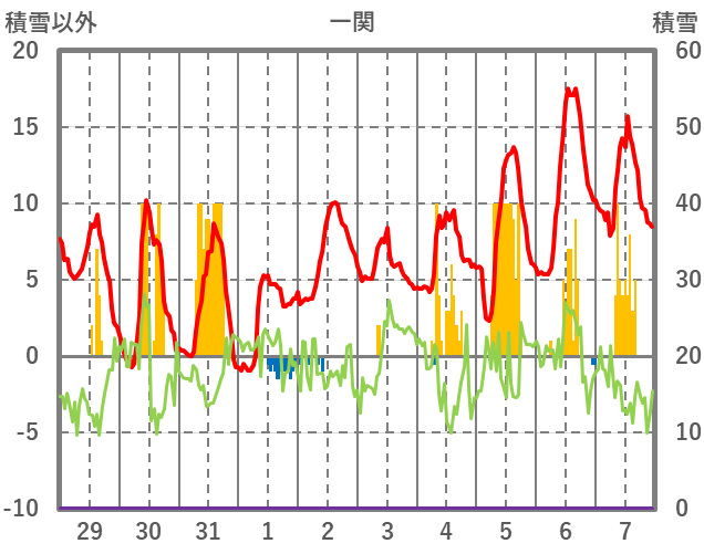 | 日 | 時 | 気温 | 降水 | 風向/風速 | 日照 | 積雪 | 降雪 |