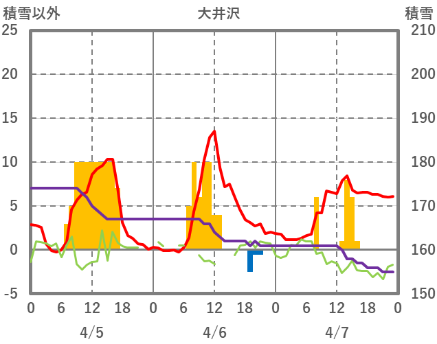 | 日 | 時 | 気温 | 降水 | 風向/風速 | 日照 | 積雪 | 降雪 |