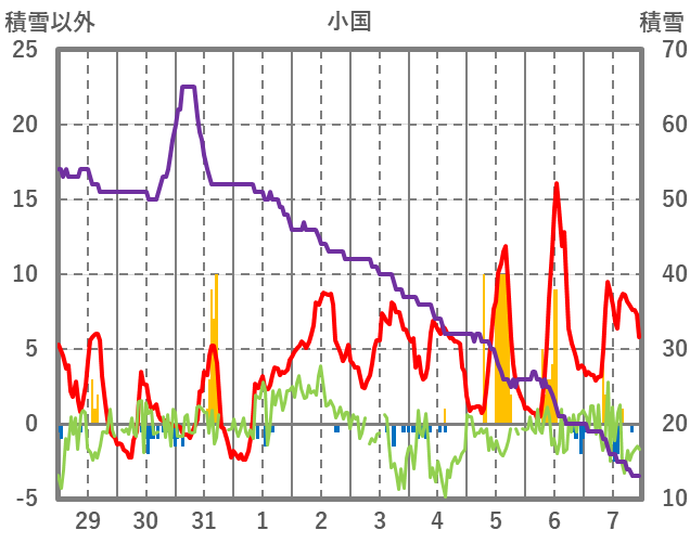 | 日 | 時 | 気温 | 降水 | 風向/風速 | 日照 | 積雪 | 降雪 |
