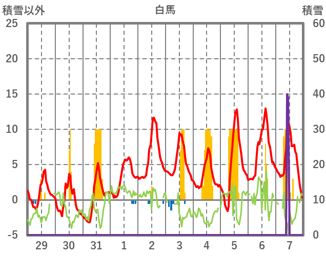 | 日 | 時 | 気温 | 降水 | 風向/風速 | 日照 | 積雪 | 降雪 |