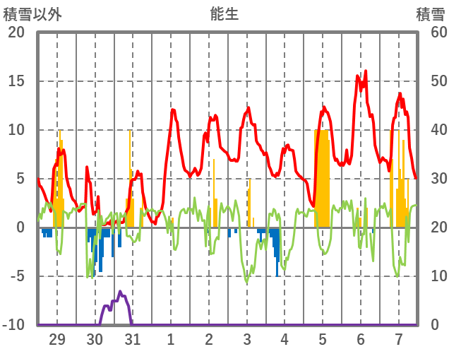 | 日 | 時 | 気温 | 降水 | 風向/風速 | 日照 | 積雪 | 降雪 |