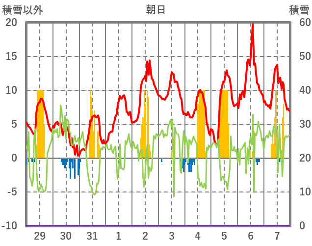 | 日 | 時 | 気温 | 降水 | 風向/風速 | 日照 | 積雪 | 降雪 |