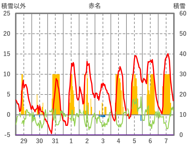 | 日 | 時 | 気温 | 降水 | 風向/風速 | 日照 | 積雪 | 降雪 |