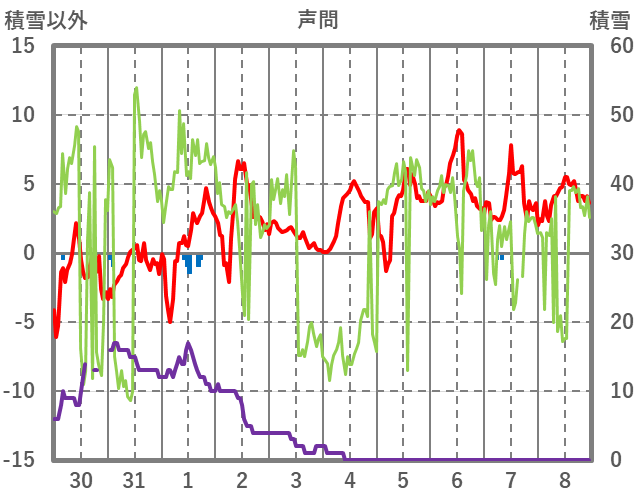 | 日 | 時 | 気温 | 降水 | 風向/風速 | 日照 | 積雪 | 降雪 |