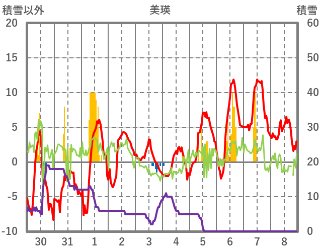 | 日 | 時 | 気温 | 降水 | 風向/風速 | 日照 | 積雪 | 降雪 |