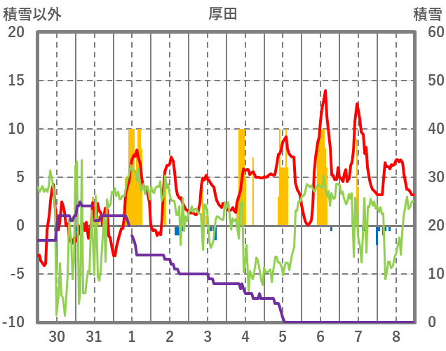 | 日 | 時 | 気温 | 降水 | 風向/風速 | 日照 | 積雪 | 降雪 |