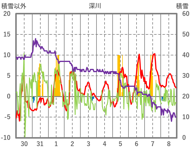| 日 | 時 | 気温 | 降水 | 風向/風速 | 日照 | 積雪 | 降雪 |