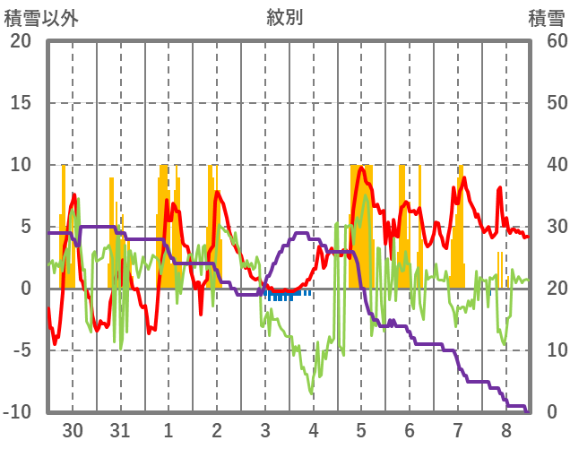 | 日 | 時 | 気温 | 降水 | 風向/風速 | 日照 | 積雪 | 降雪 |