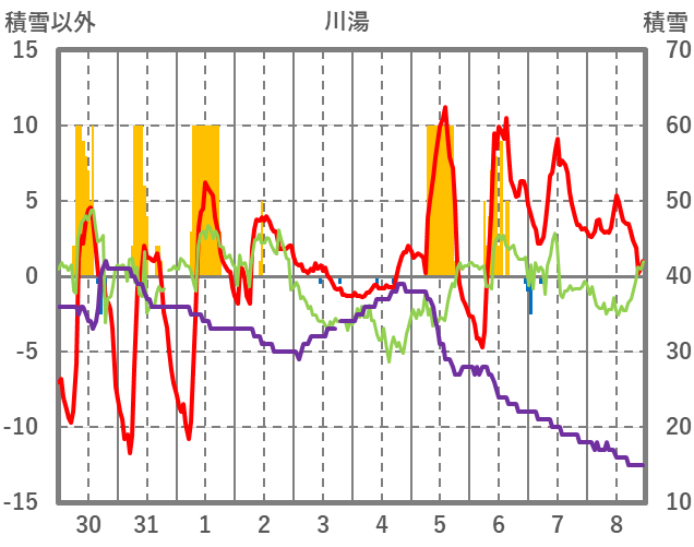 | 日 | 時 | 気温 | 降水 | 風向/風速 | 日照 | 積雪 | 降雪 |