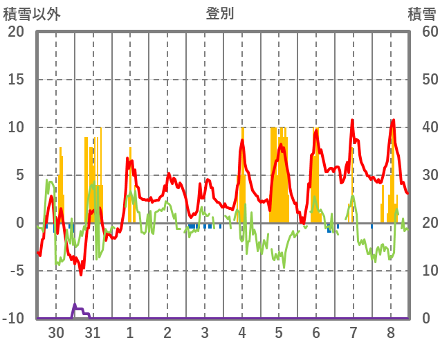| 日 | 時 | 気温 | 降水 | 風向/風速 | 日照 | 積雪 | 降雪 |