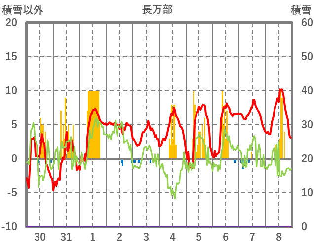 | 日 | 時 | 気温 | 降水 | 風向/風速 | 日照 | 積雪 | 降雪 |