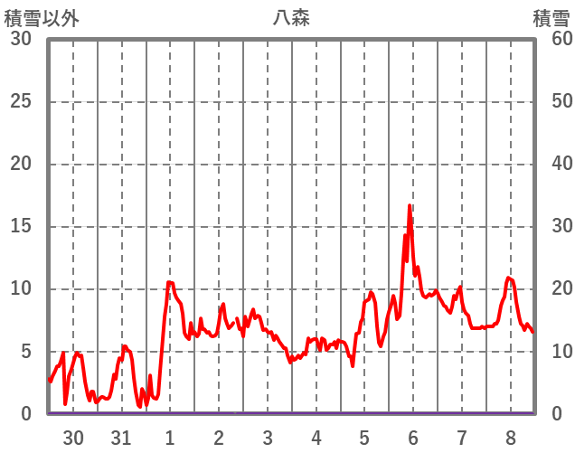 | 日 | 時 | 気温 | 降水 | 風向/風速 | 日照 | 積雪 | 降雪 |