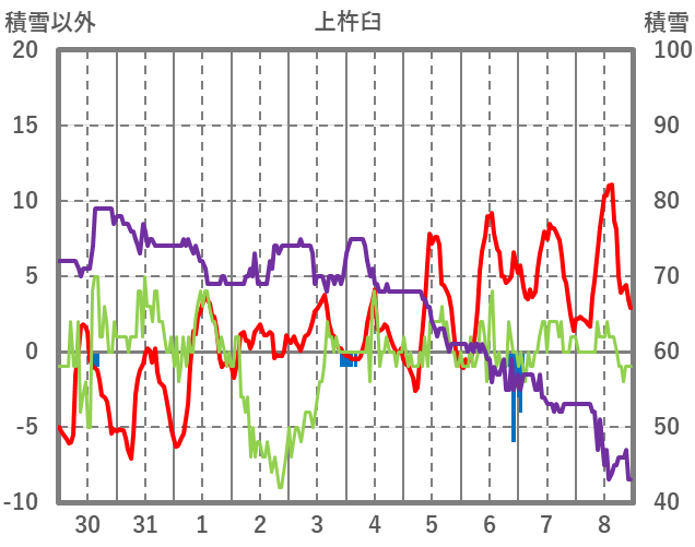 | 日 | 時 | 気温 | 降水 | 風向/風速 | 日照 | 積雪 | 降雪 |