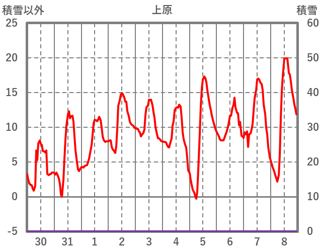 | 日 | 時 | 気温 | 降水 | 風向/風速 | 日照 | 積雪 | 降雪 |