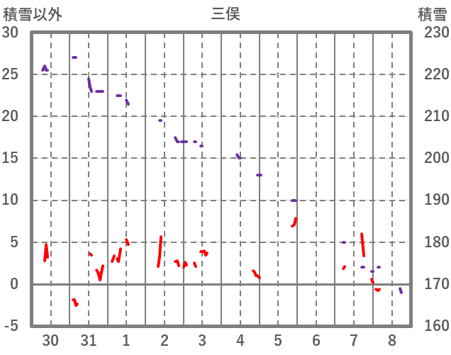 | 日 | 時 | 気温 | 降水 | 風向/風速 | 日照 | 積雪 | 降雪 |