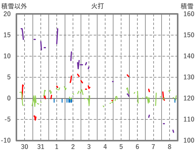 | 日 | 時 | 気温 | 降水 | 風向/風速 | 日照 | 積雪 | 降雪 |