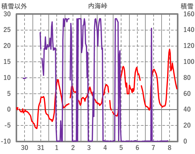 | 日 | 時 | 気温 | 降水 | 風向/風速 | 日照 | 積雪 | 降雪 |