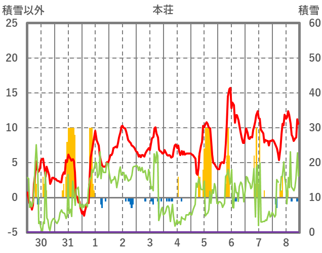 | 日 | 時 | 気温 | 降水 | 風向/風速 | 日照 | 積雪 | 降雪 |