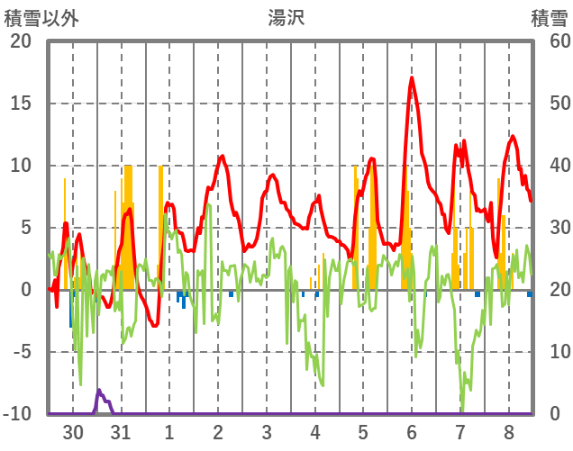| 日 | 時 | 気温 | 降水 | 風向/風速 | 日照 | 積雪 | 降雪 |