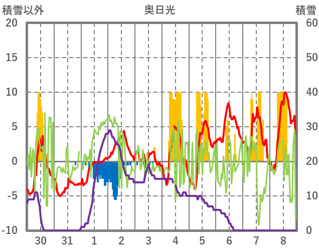 | 日 | 時 | 気温 | 降水 | 風向/風速 | 日照 | 積雪 | 降雪 |