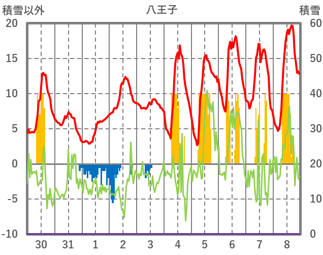 | 日 | 時 | 気温 | 降水 | 風向/風速 | 日照 | 積雪 | 降雪 |