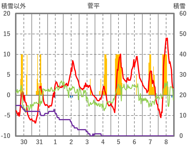 | 日 | 時 | 気温 | 降水 | 風向/風速 | 日照 | 積雪 | 降雪 |