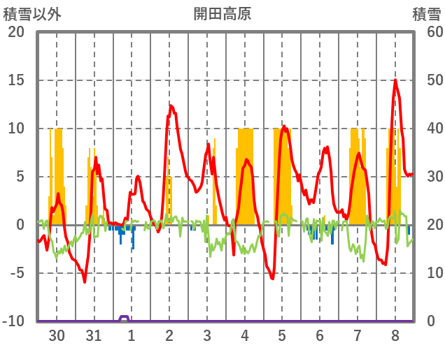 | 日 | 時 | 気温 | 降水 | 風向/風速 | 日照 | 積雪 | 降雪 |